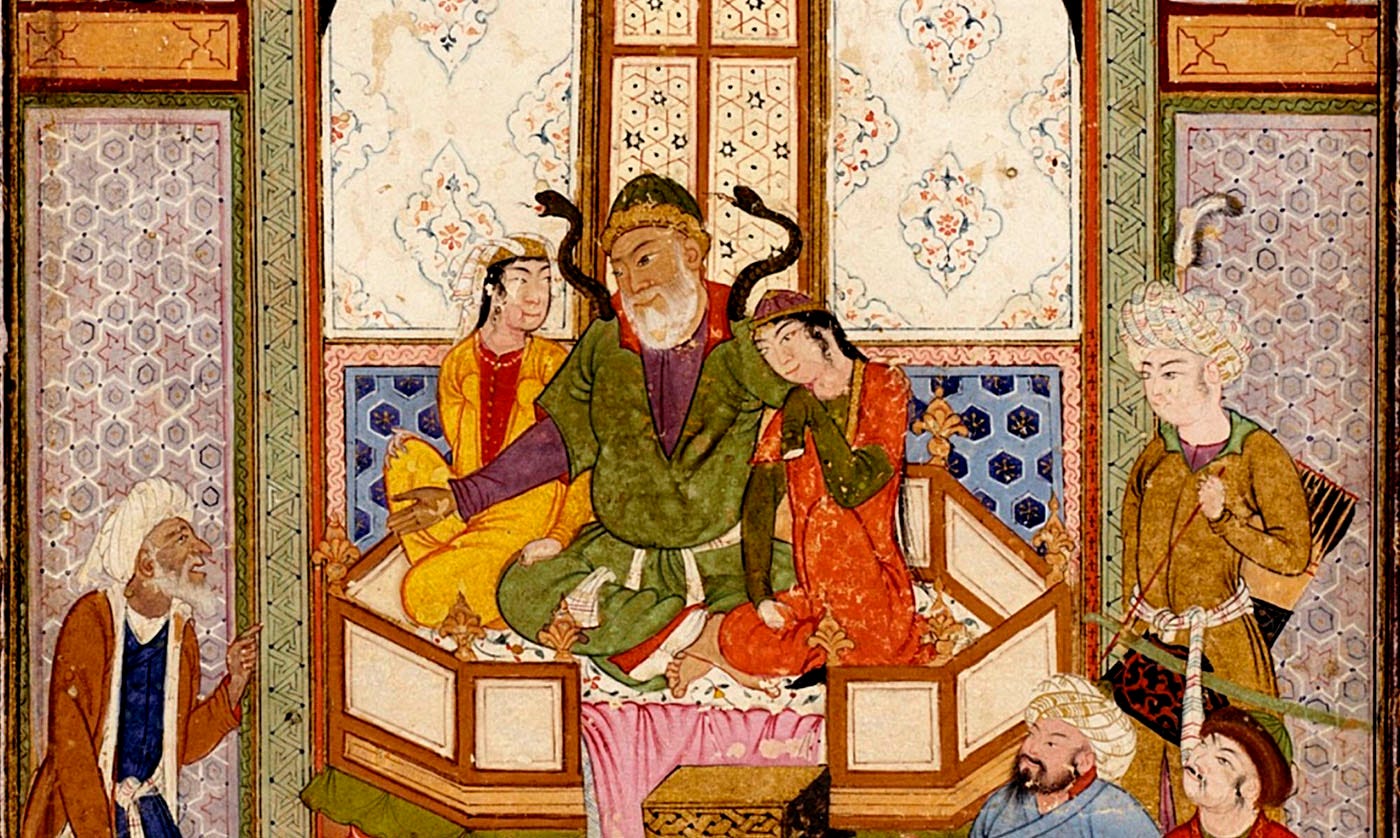 In the Shahnameh, Zahhak is not simply a bad ruler. He is the tyrant whose power is demonic, corrupt at the root, and literally fed by the young: after Ahriman kisses his shoulders, serpents grow from them, and to calm them he must be fed each day with the brains of two young men.